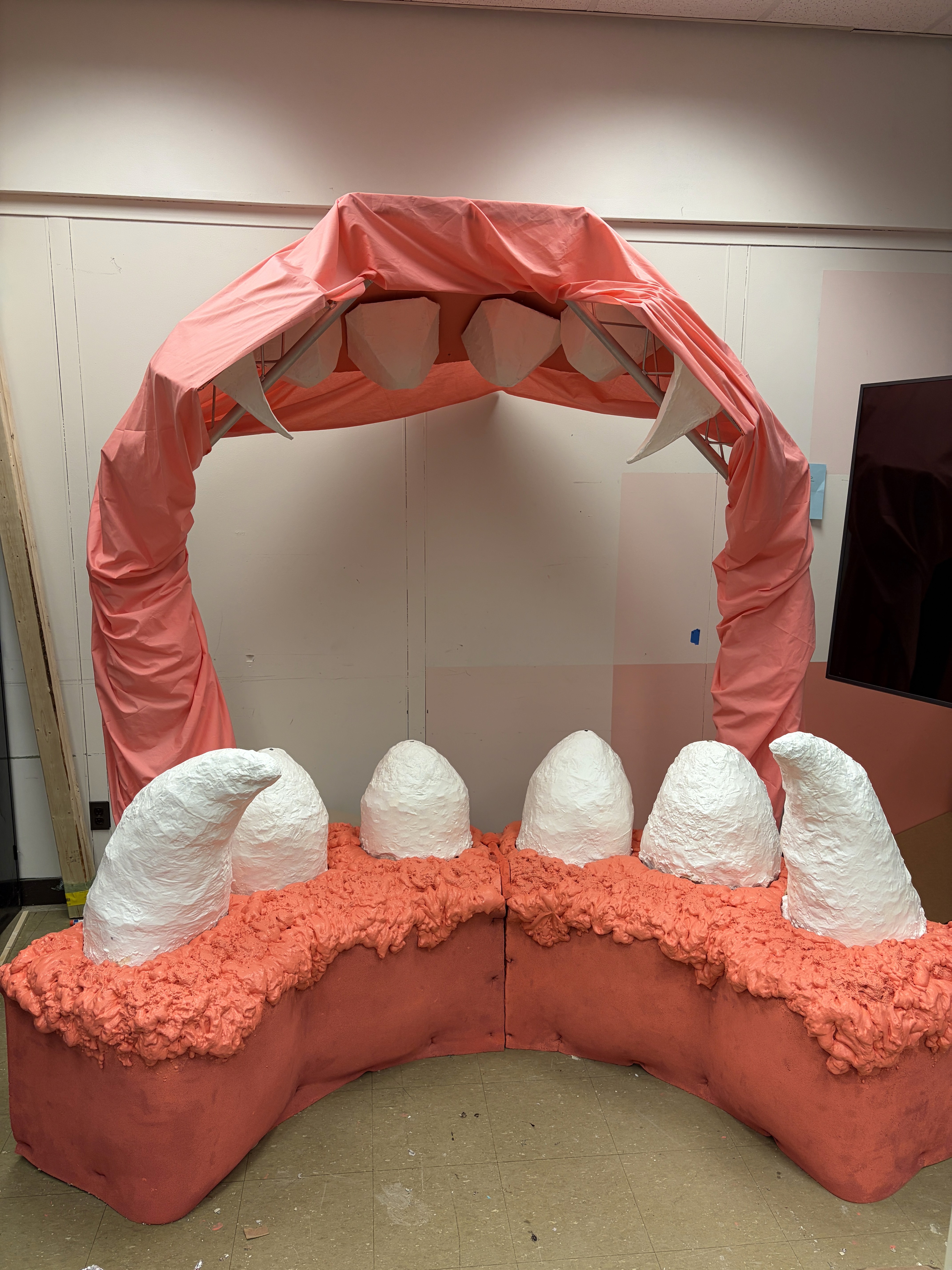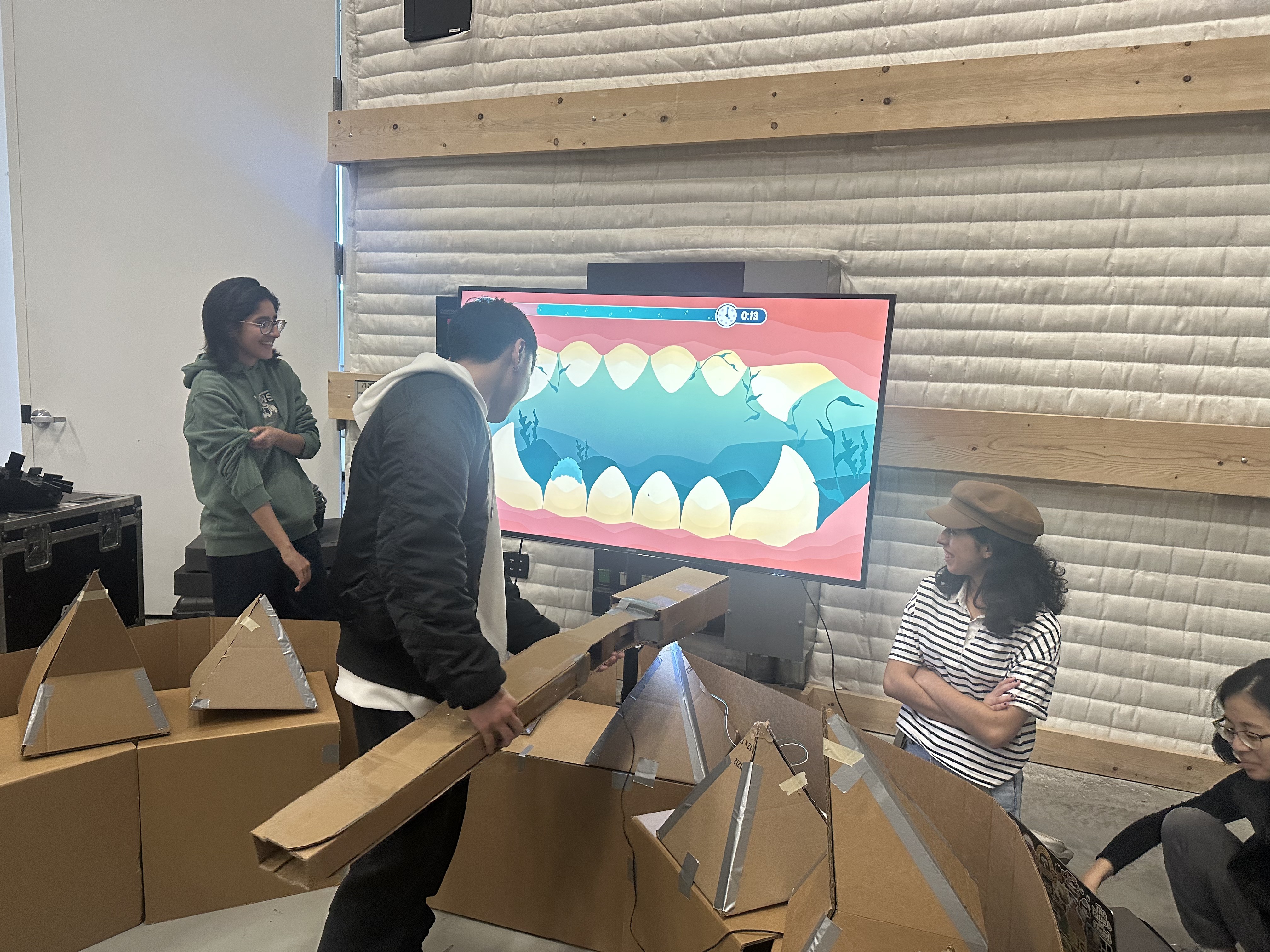Our build process involved extensive sketching, planning structural details, and choosing materials that fit both our vision and our budget. Each part — teeth, gums, brush, and flosser — was designed individually but meant to function together. We used cardboard for the main structure, foam for soft organic shaping, Arduino components for functionality, and even repurposed materials (“trash”) to give the gums a more natural, textured look.