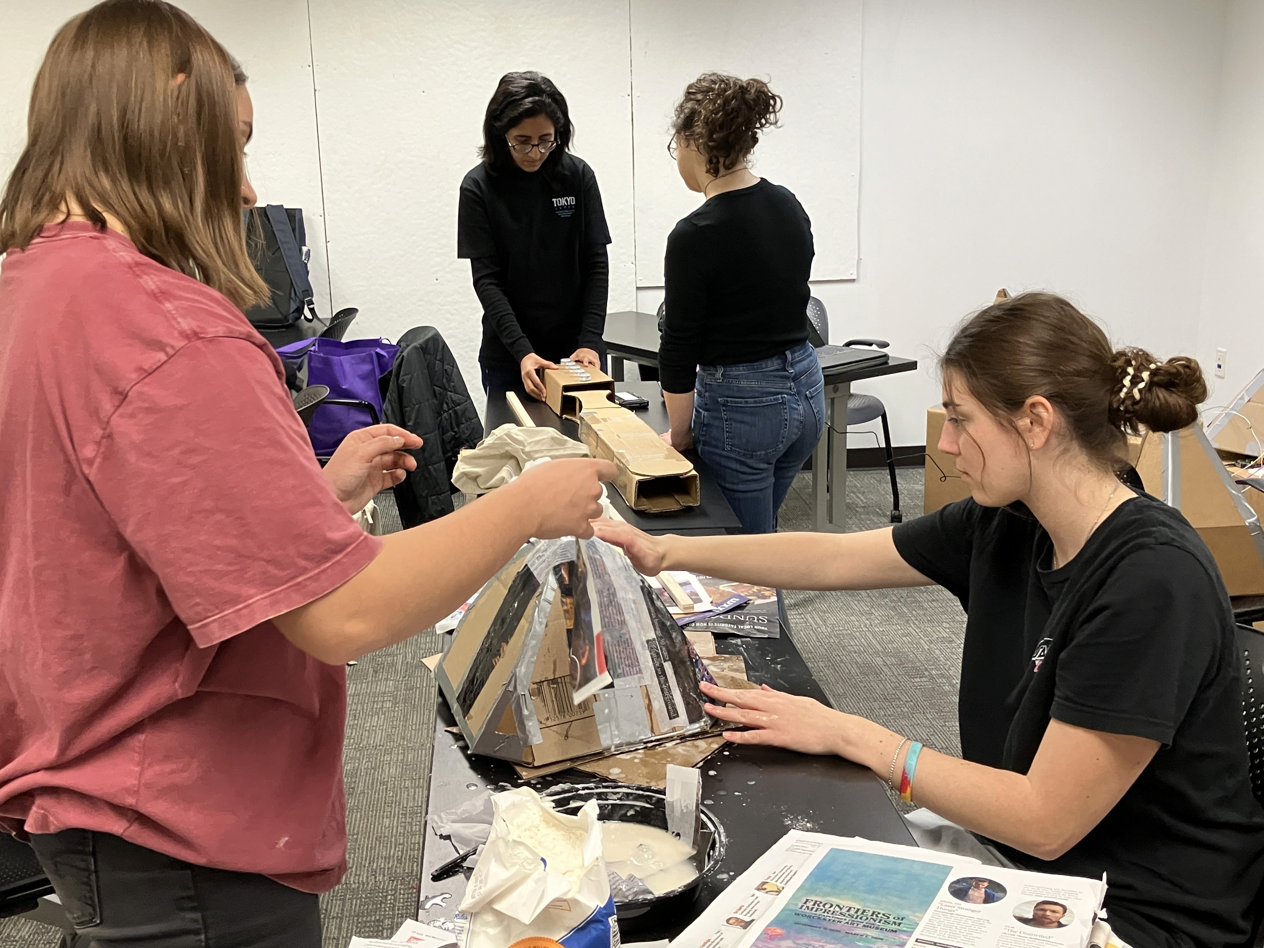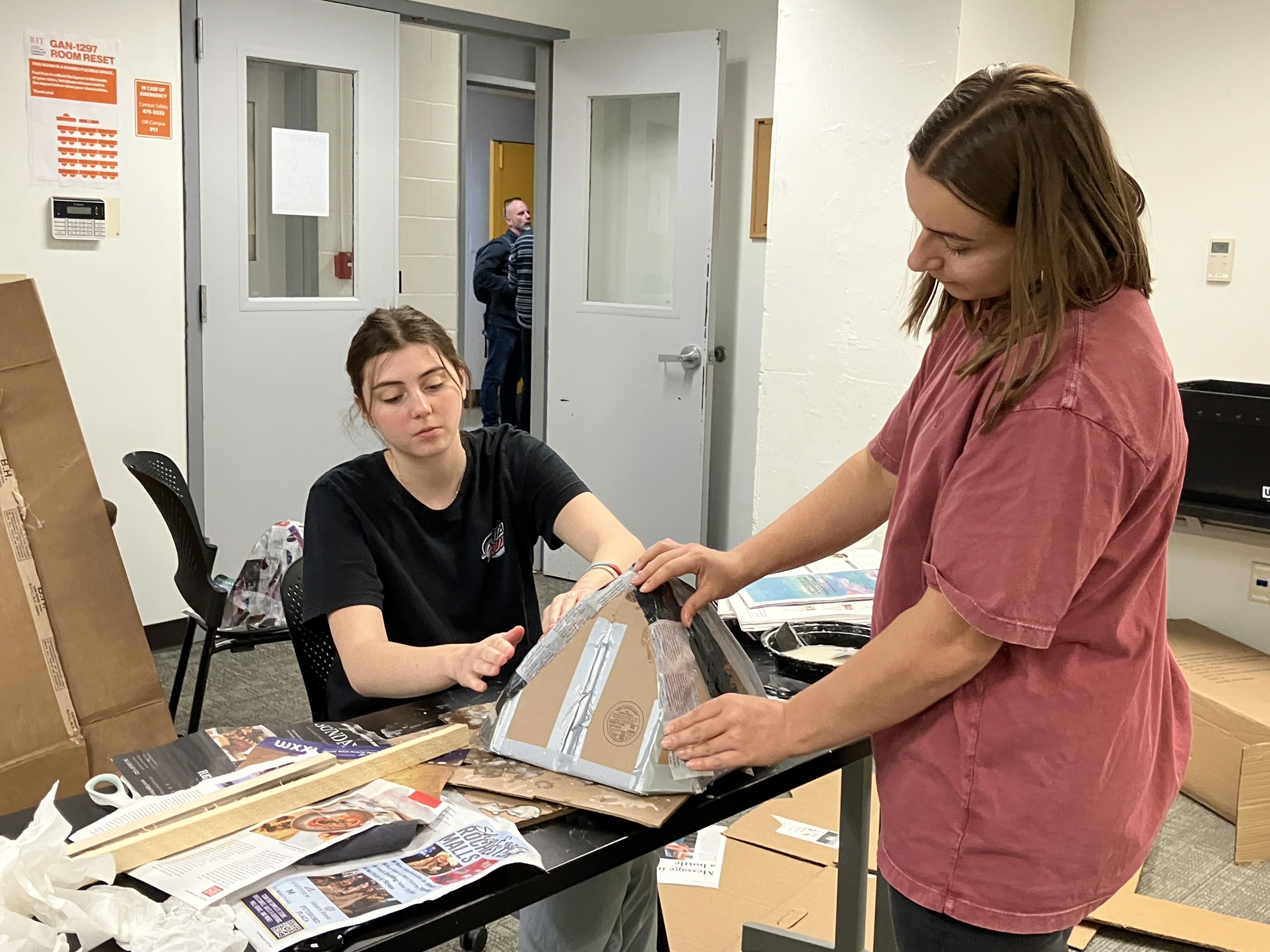 Danielle, Maya applying paper mache to cardboard teeth